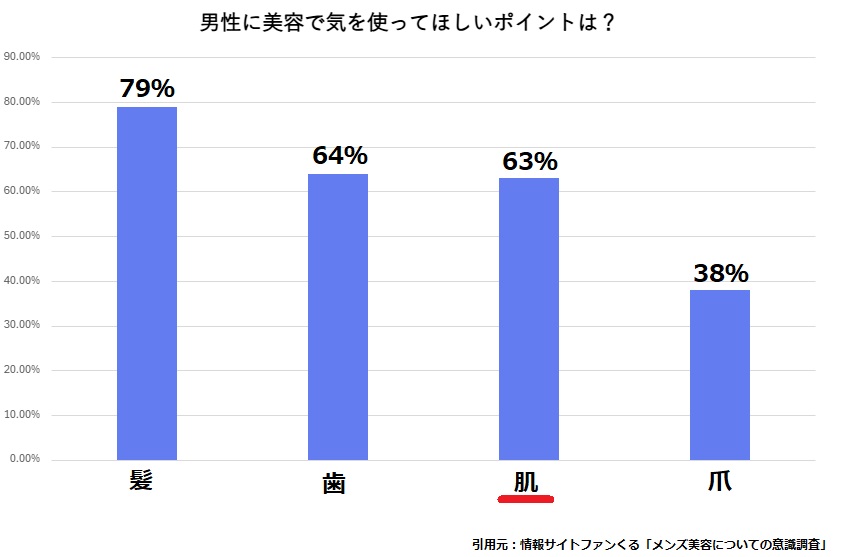 さらに、同じアンケートの中で「男性に美容で気を使ってほしいポイントは?」という質問に対しては、63%の女性が“肌”と回答しました。これは、他の項目を押さえてトップ3に入る結果であり、女性が男性の肌をよく見ていることを示しています。
